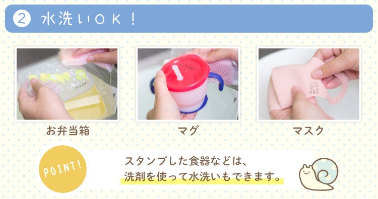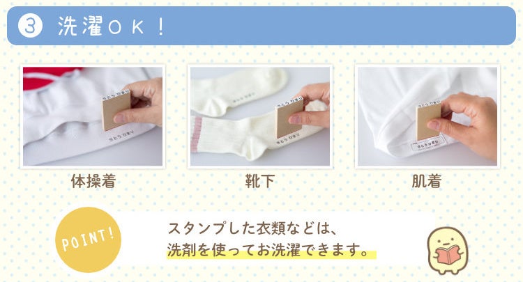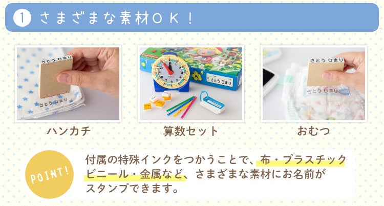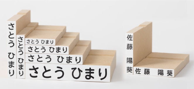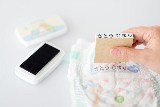 こちらはおむつや肌着やくつした、コップやお弁当箱、クレヨンやえんぴつ、お道具袋やノートといった、サイズの異なるさまざまな持ち物にスタンプできる大小8個のお名前スタンプ。小学校高学年まで使える漢字スタンプ2個つきで、使う場面の多いオーソドックスなサイズを選びました。