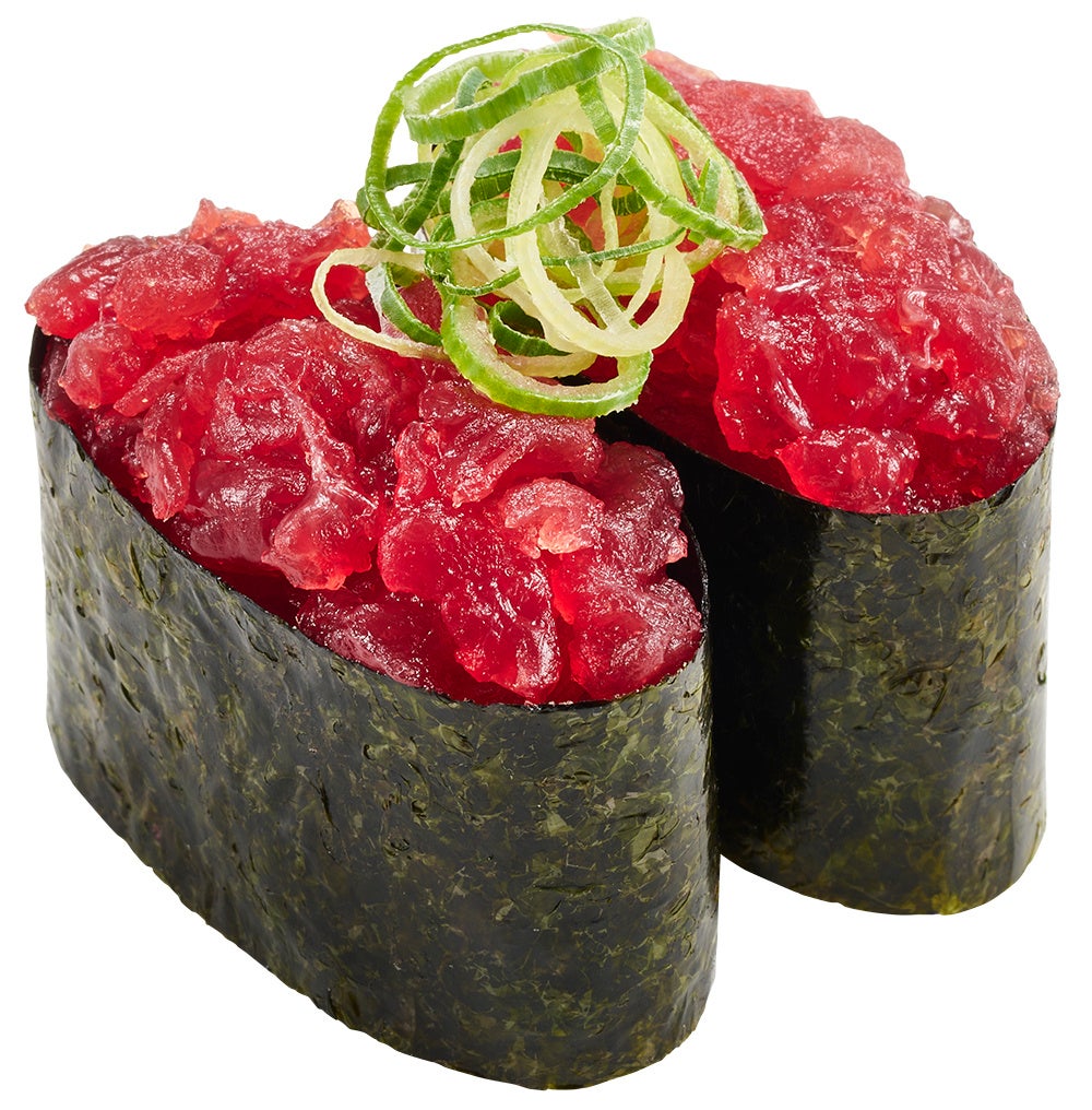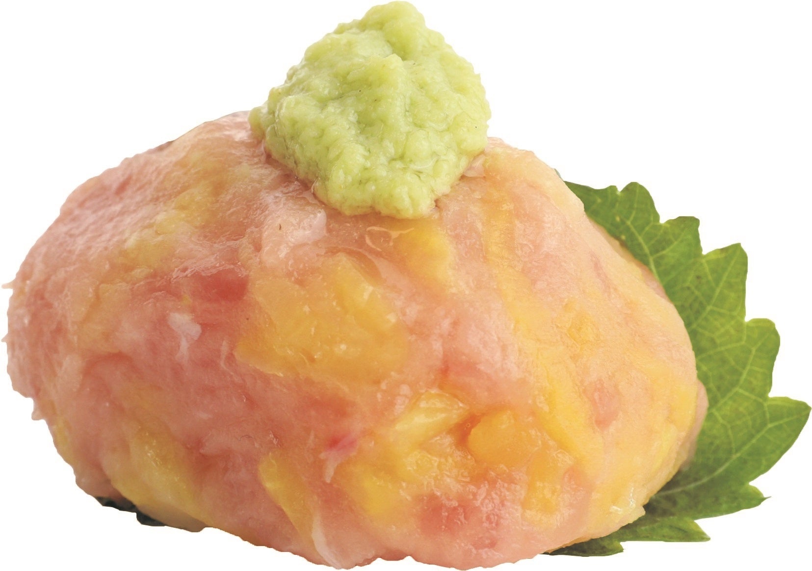 そのほかにも、まぐろの進化系おすしとして、ねぎまぐろに食感の良いたくあんを合わせてしゃりを包み込み、おはぎのような見た目に仕立てた「まぐろのおはぎ」、まぐろ界のミナミの王とも称される天然のインドまぐろの希少部位である中落ちを使用した「天然インド鮪中落ち軍艦」、ねぎまぐろの上にサーモンと焼とろサーモンを山のように重ねて、いくらをトッピングした「サーモンマウンテン」などが登場します。