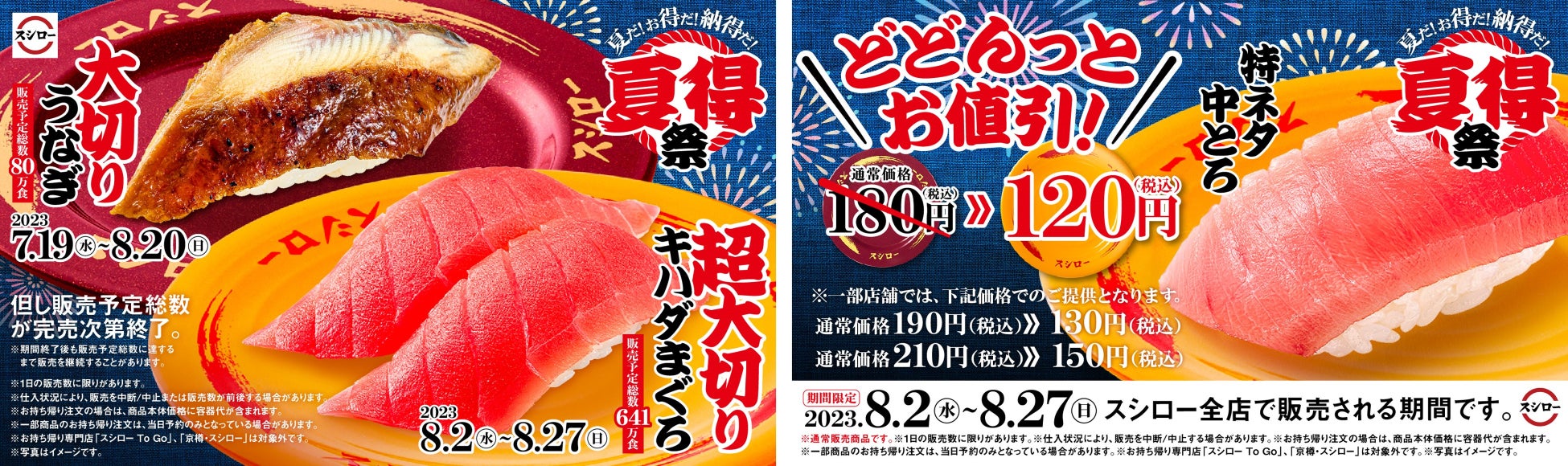 株式会社あきんどスシロー(本社:大阪府吹田市、代表取締役社長:新居 耕平)は、8月2日(水)より、超大切りのキハダまぐろや定番ネタでも人気の「特ネタ中とろ」が一番お手頃な“黄皿”で登場する『夏得祭』を全国のスシローにて期間限定で開催いたします。