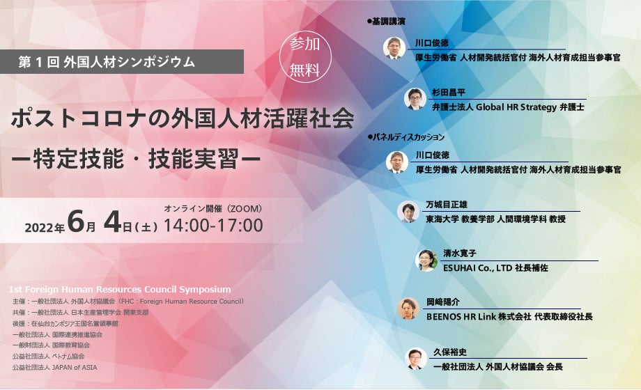 BEENOS株式会社(東証プライム:3328)の連結子会社で、SaaS型越境HRプラットフォーム「Linkus(リンクス、https://linku-s.com/)」を運営し、外国人雇用をテクノロジーで支援するBEENOS HR Link株式会社(以下「BEENOS HR Link」)の代表岡﨑陽介は、2022年6月4日(土)、一般社団法人外国人材協議会(以下FHC)が主催し、産官学民の第一線で活躍する専門家を招いて講演とパネルディスカッションを行う「第1回外国人材シンポジウム」にパネリストとして登壇いたします。無料で参加できるオンライン形式ですので,是非お気軽にご参加下さい。