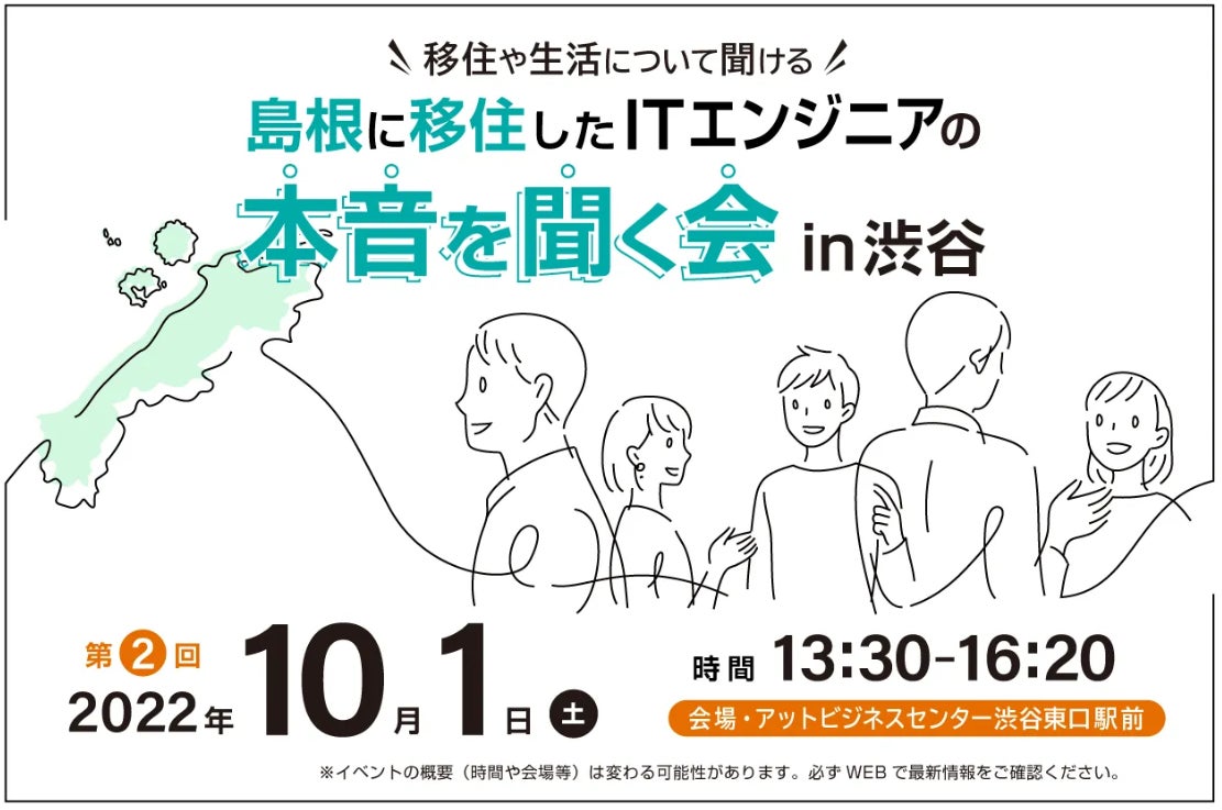 島根県は、全国で活動するITエンジニアを対象に、島根県への移住・転職を支援するイベント「島根に移住したITエンジニアの本音を聞く会」を令和4年10月1日(土)に開催します。