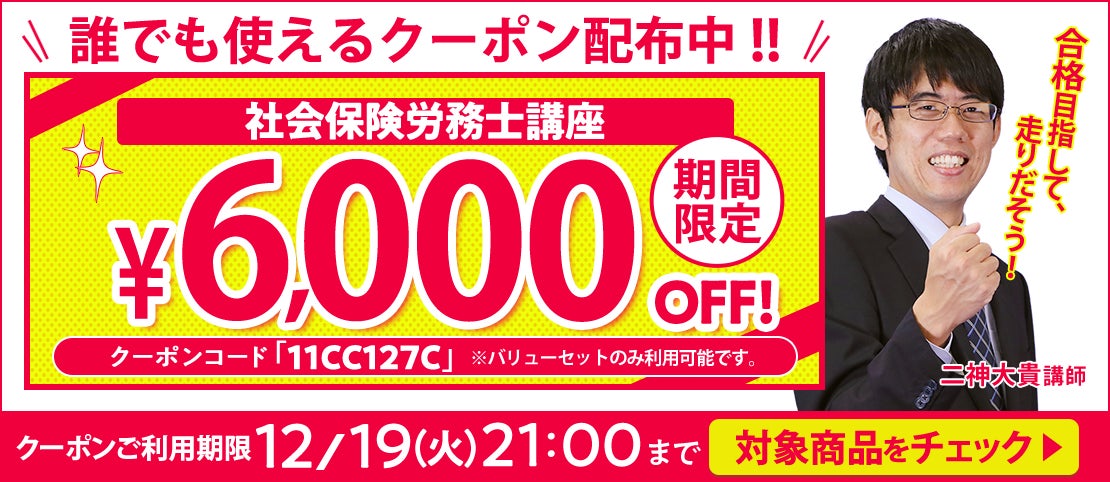 【期間限定】社労士講座 誰でも使えるクーポン 配布中!