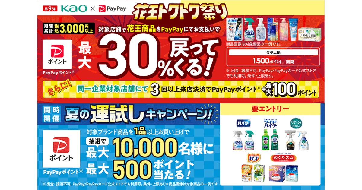 PayPay株式会社(以下、PayPay)とLINEヤフー株式会社(以下、LINEヤフー)は、対象店舗で花王株式会社(以下、花王)の商品を、キャッシュレス決済サービス「PayPay」で購入したユーザーに、花王商品の累計購入金額の最大30%分を「PayPayポイント」(※1)で付与する「花王商品の購入で最大30%戻ってくるキャンペーン」(以下、本キャンペーン)を、2024年6月1日(土)から6月30日(日)まで実施します。