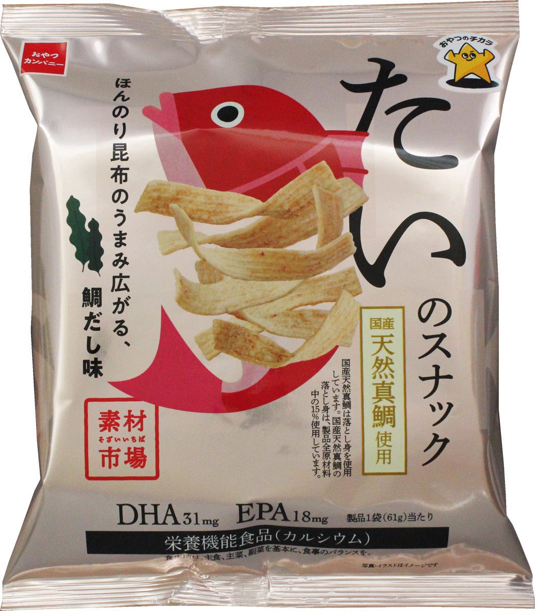 国産天然真鯛を生地に練り込み、ほんのり昆布のうまみをきかせた鯛だし味に仕上げています。カリッサクッとしたスナック菓子らしい軽快な食感で、美味しく食べながら、カルシウム、EPA、DHAなどの栄養成分も摂れるヘルシー感覚のおやつ『素材市場 たいのスナック』は、仕事や家事の合間のひとときに、お酒のおつまみに、育ち盛りのお子様のおやつにと、不足しがちな栄養素を賢く毎日の生活に取り入れたい方にピッタリなスナック菓子です。