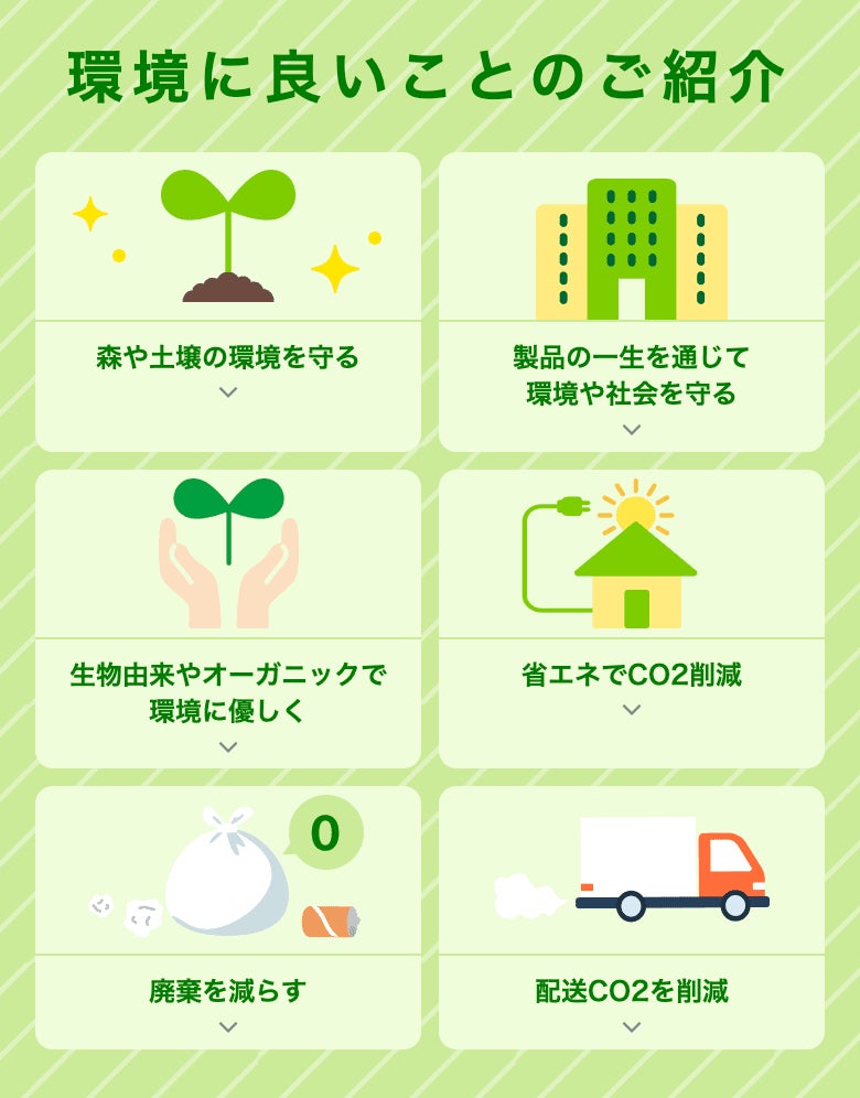 今回「ECOチャレンジ」の機能を改善し、普段購入している商品がどう環境に配慮されているか、貢献しているかわからないといった課題解決のため、「ECOチャレンジ」のミッション対象商品を省エネでCO2削減ができるもの、森や土壌の環境を守るもの、廃棄を減らすものなど、それぞれどのように環境に配慮、貢献しているかわかるよう「認証ラベル」別、また食品やコスメなどカテゴリ別でも探せるようになりました。現在、廃棄を減らすラベルレス商品、配送CO2を減らす国産商品、食品ロス・廃棄を減らす訳あり商品など、対象商品数は2万点を超え、該当商品の詳細ページでは「環境にやさしい商品です。ECOチャレンジのストアが貯まります」といったバナーも表示され、ECOな商品が見つけやすく、また買いやすくもなりました。