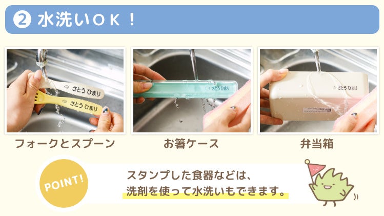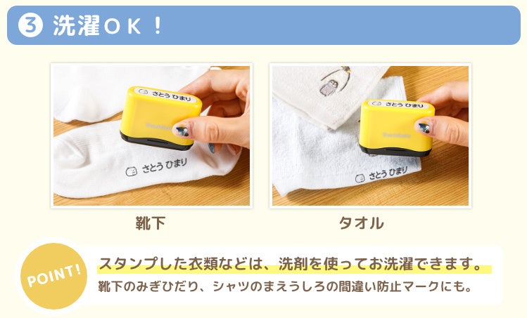 しろくま、ぺんぎん?、とんかつ、ねこ、とかげなど選べるイラストは10種類。布やプラスチックなどあらゆる素材にポンポン押せて洗濯や洗い物もOK。とっても便利な一行タイプのネームスタンプです。