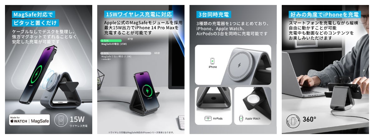 - ピタッと置くだけ:マグネット式ワイヤレス充電器とApple Watch用ワイヤレス充電器、パッド型ワイヤレス充電器を1台にまとめたワイヤレス充電ステーション。MagSafe対応のiPhoneやApple Watch、AirPods等のワイヤレスイヤホンの3台を置くだけで同時に充電できます。