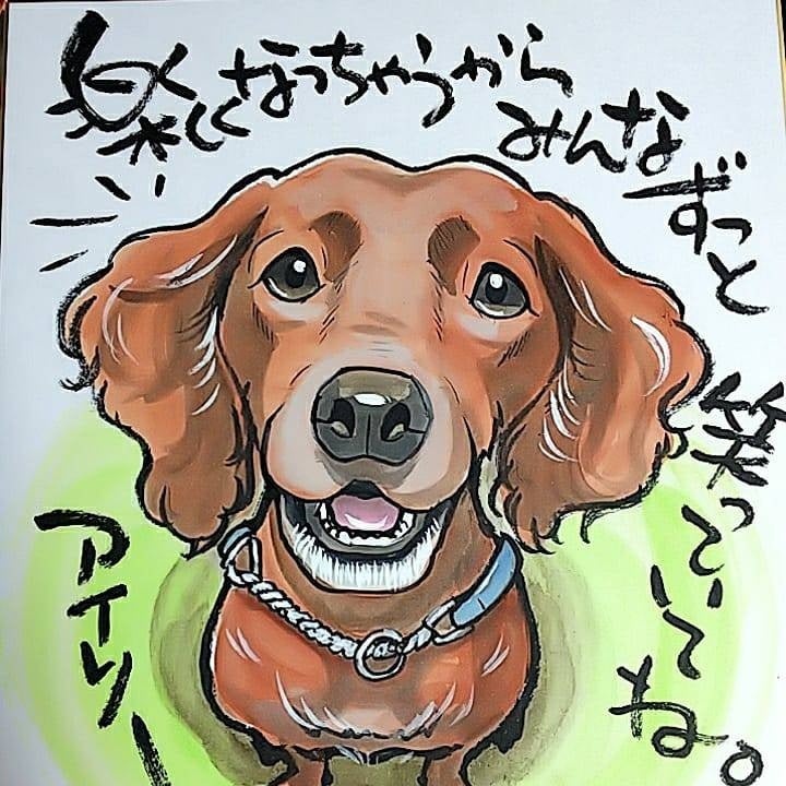 似顔絵イラストレーターの『さくらたんぽぽ』。愛犬以外の動物や人の似顔絵のほか、色紙だけでなくバッグにもイラストを描きます。