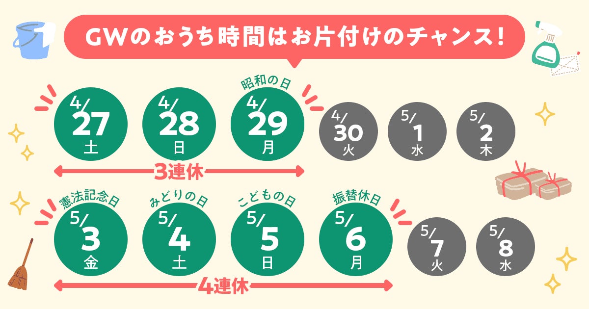 2024年のGW日程を見ると、3連休と4連休にはさまれて4月30日(火)から5月2日(木)は平日になっています。そのため、今年は長期の旅行ではなく、自宅や近場で連休を過ごす方もいれば、実家に帰省する方もいるのではないでしょうか。「Yahoo!フリマ」では、この連休中の在宅時間を利用して自宅や実家に眠っているアイテムを見直し、フリマアプリでの出品を通して片付ける”フリマ断捨離”をおすすめしています。