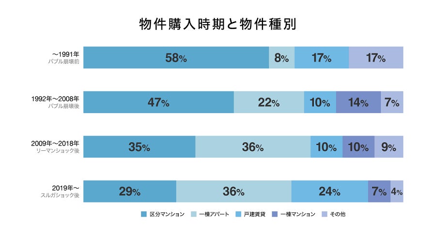 続いて、不動産投資を始めた時期を見てみましょう。ここでは不動産投資市場に大きな影響を与えたバブル崩壊、リーマンショック、スルガショック(スルガ銀行の不正融資問題発覚に伴う金融庁の融資引き締め)を区切りとして、4つの時期に分けて分析していきます。スルガショック後の時期には、コロナ禍(2020年~)も含まれます。