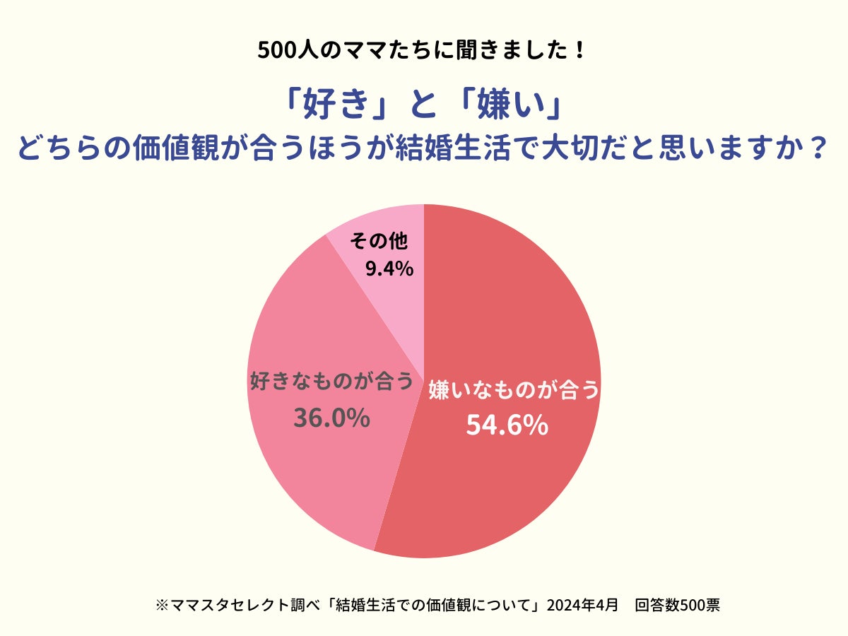選択肢には「好きなものが合う(嫌いなものは違ってもよい)」「嫌いなものが合う(好きなものは違ってもよい)」「その他」の3つを設定。500人のママたちから率直な意見が集まりました。