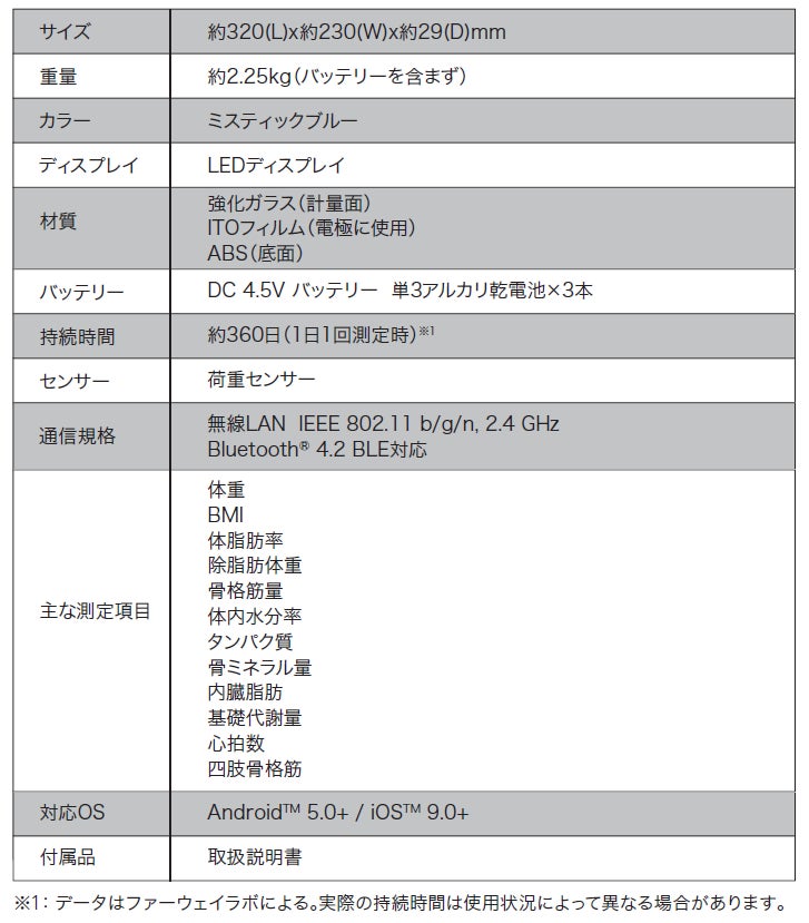 ※重さの範囲は5kgから150kgまでです。6歳以下のお子様は体重のみ測定可能です。6~17歳は心拍数測定はサポートしていません。80歳以上の方は体重と心拍数のみ測定可能です。
