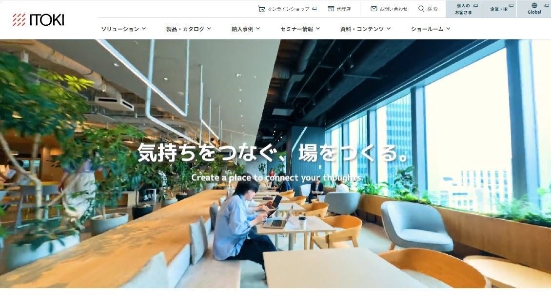 「気持ちをつなぐ、場をつくる。」をサイトコンセプトに、法人のお客さま向けに製品やソリューションを紹介しています。オフィス以外にも、「医療福祉施設」「教育施設」「工場・物流施設」「文化施設」など分野別にソリューションをご覧いただくことも可能です。また、イトーキが手掛けた多様な納入事例やセミナー情報のご案内、コラム記事など「働く」にまつわるお役立ち情報も充実しています。