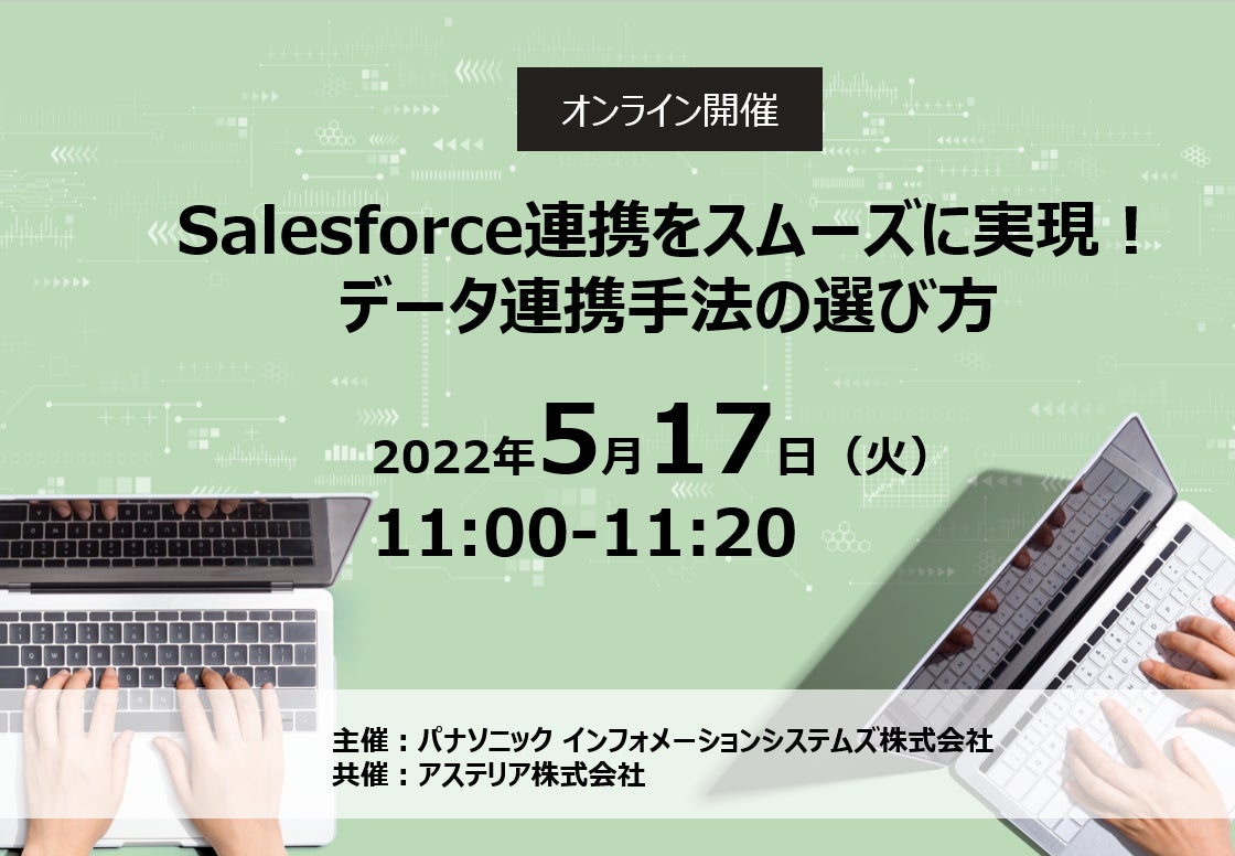 パナソニック インフォメーションシステムズ株式会社は、2022年5月17日(火)に『Salesforceとのデータ連携手法選定のコツ』にフォーカスしたオンラインセミナーを開催します。
