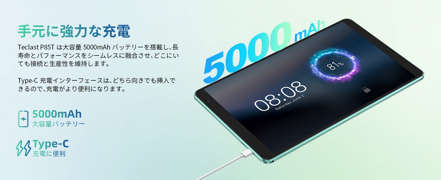 Teclast「P85T」には、高度な2MP Alデュアルカメラシステムが搭載されており、焦点速度を巧みに向上させ、映像の調整を行っています。補助フラッシュライトと調和して、低照度の写真を強化し、例外的な明瞭さと輝きで素晴らしい瞬間を簡単に捉えるのに役立ちます。