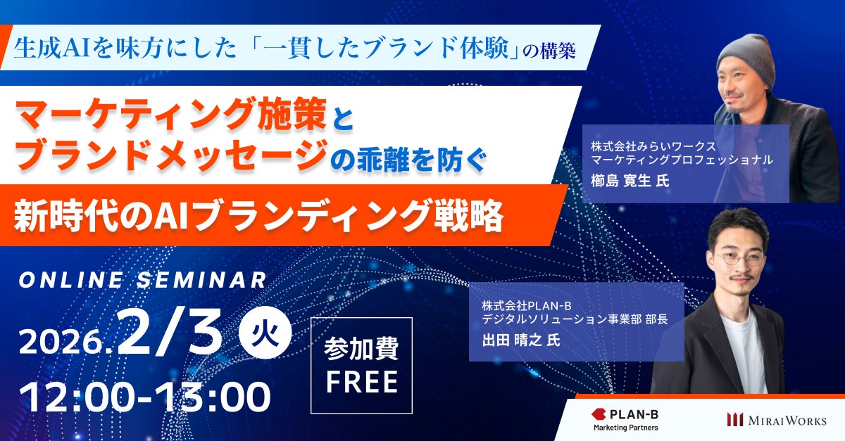 即戦力となるプロフェッショナル人材のマッチングサービス『フリーコンサルタント.jp』を展開する株式会社みらいワークス(本社:東京都港区、代表取締役社長 岡本 祥治、以下「当社」)は、2026年2月3日(火)、株式会社PLAN-Bマーケティングパートナーズと共催でオンラインセミナーを開催します。
