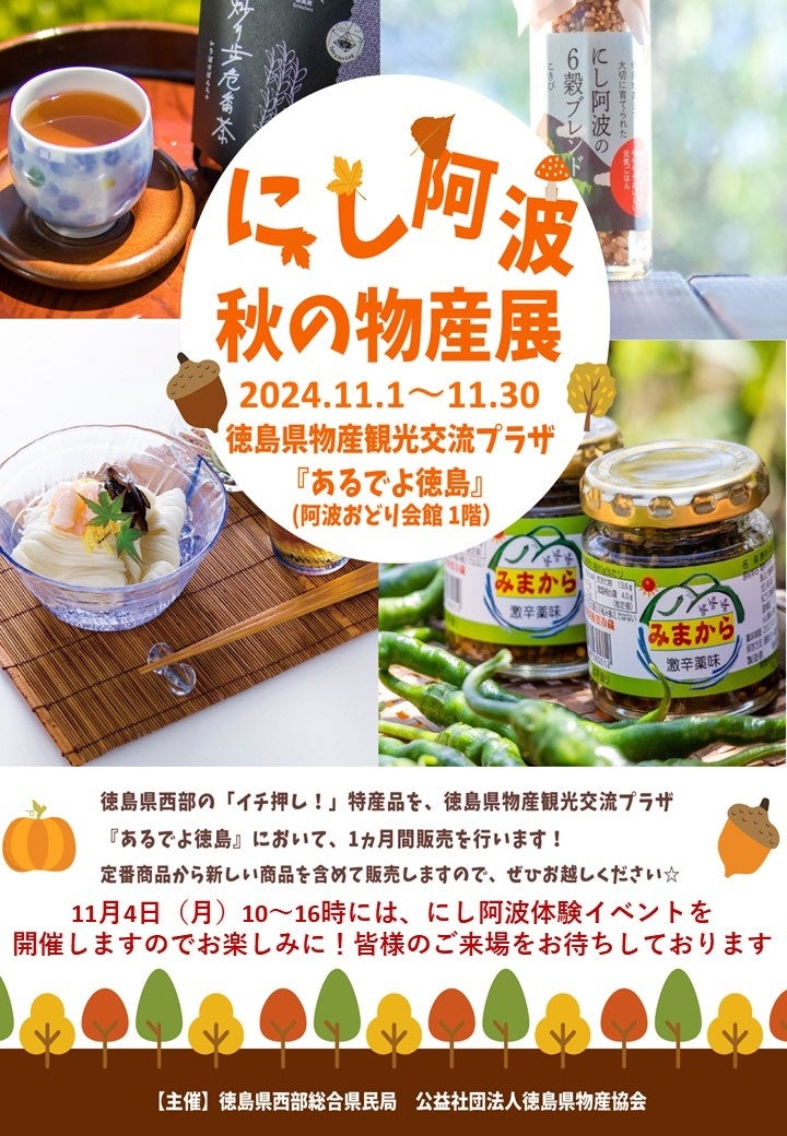 県西部選りすぐりの特産品の展示・販売や、観光情報の発信など、地域の魅力を広く紹介するため、「にし阿波 秋の物産展」が開催!