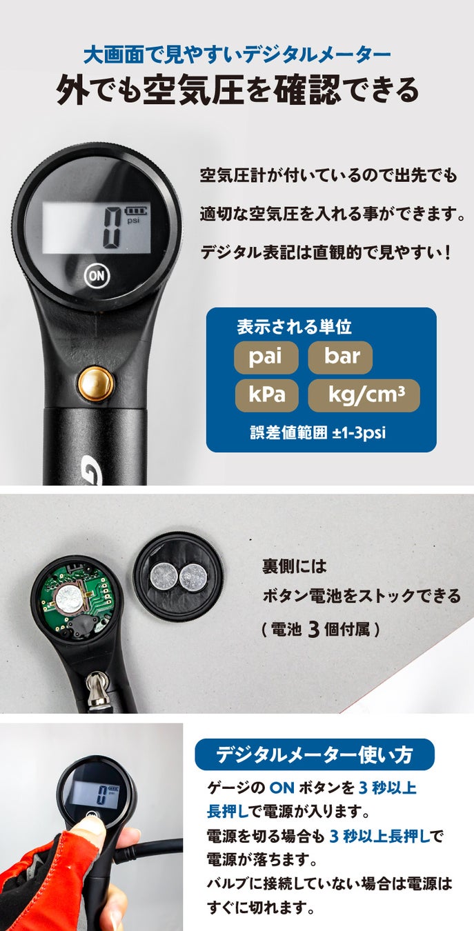 高圧に対応したデジタル表記の空気圧計(ゲージ付き)の携帯ポンプです。