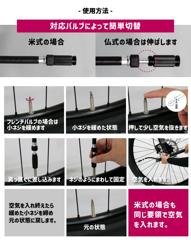 仏式、米式バルブ対応でロードバイクやクロスバイク、MTB、ミニベロなどの