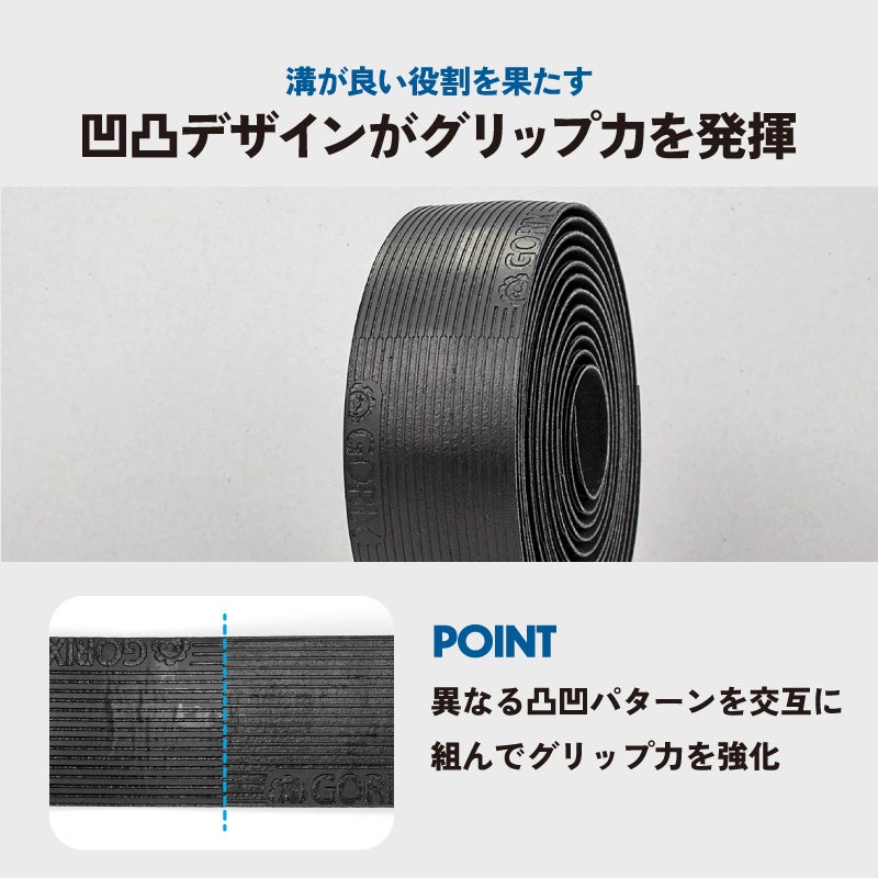 バーテープ表面に2パターンの異なる凸凹デザインを組み合わせてグリップ力を強化しています。