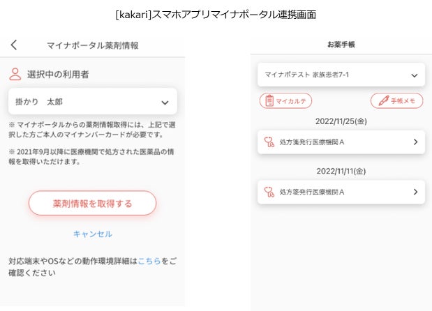 これにより、取得した薬剤・調剤情報を「kakari」のスマホアプリ内のお薬手帳にマイナポータルより自動的に取得することができるようになります。