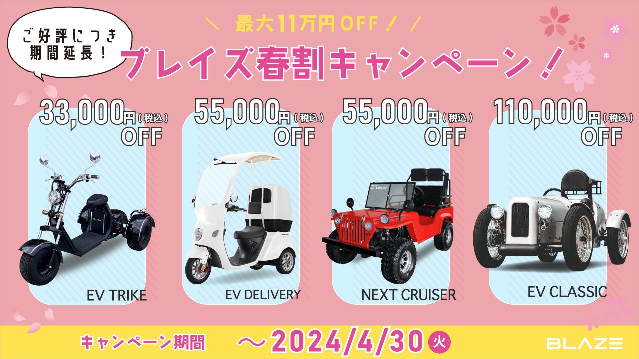【ご好評につき!】ブレイズEV3輪バイク&EVミニカー「春割キャンペーン」実施期間延⻑のお知らせ