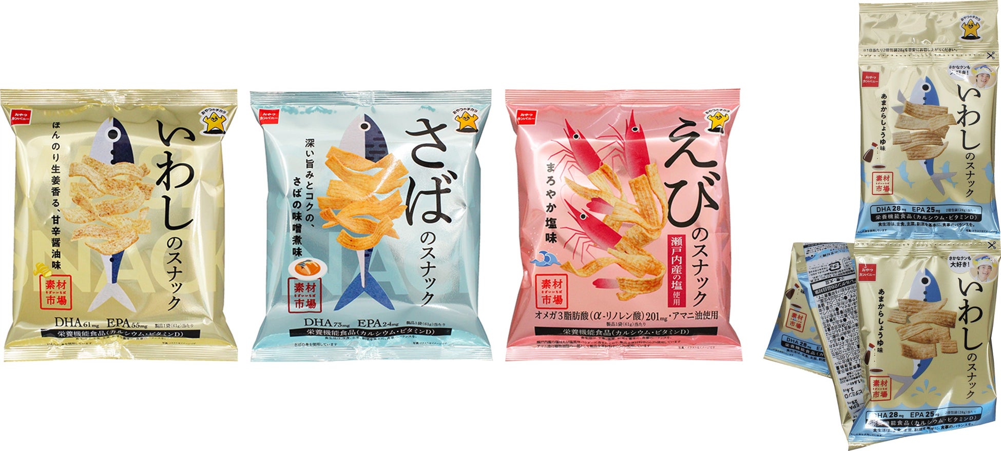 魚を食べたいけれど、料理や後片付けが面倒で少し敬遠されがちな魚を、より多くの方に、より手軽に味わっていただくため、青魚をたっぷり生地に練り込んだ『素材市場 いわしのスナック』『素材市場 さばのスナック』を開発。カリッサクッとしたスナック菓子らしい軽快な食感で、美味しく食べながら、カルシウム、ビタミンD、DHA、EPAの栄養素も摂れるヘルシー感覚のおさかなのスナック菓子『素材市場 いわしのスナック』『素材市場 さばのスナック』を発売しています。