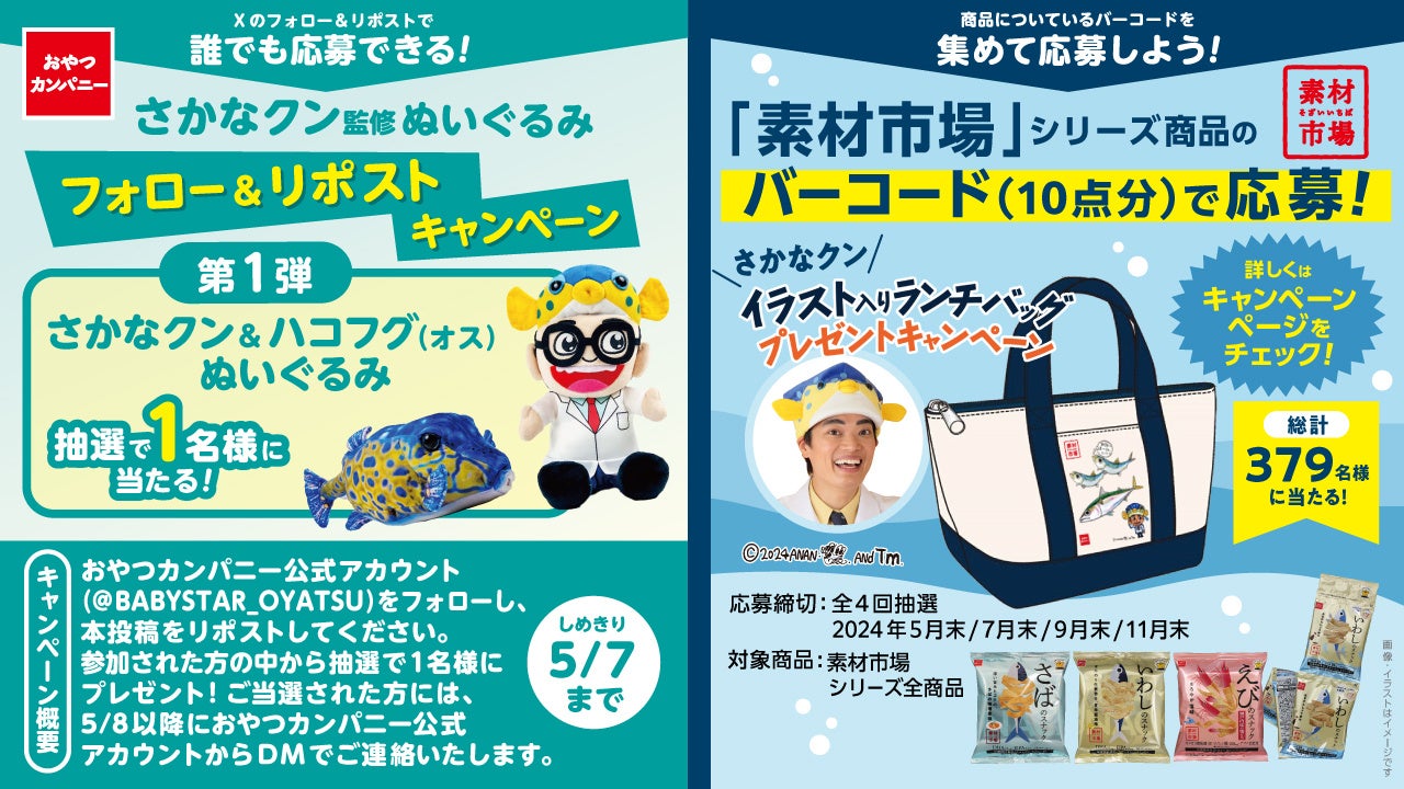 そんな『素材市場』シリーズのアンバサダーに、国立大学法人東京海洋大学の名誉博士/客員教授のさかなクンが就任。ちょっと敬遠されがちな”魚”をスナック菓子にした『素材市場』シリーズの美味しさと魅力をもっと多くの人に知っていただくため、おやつカンパニーX公式アカウント(@BABYSTAR_OYATSU)にてフォロー&リポストキャンペーンを開催します。