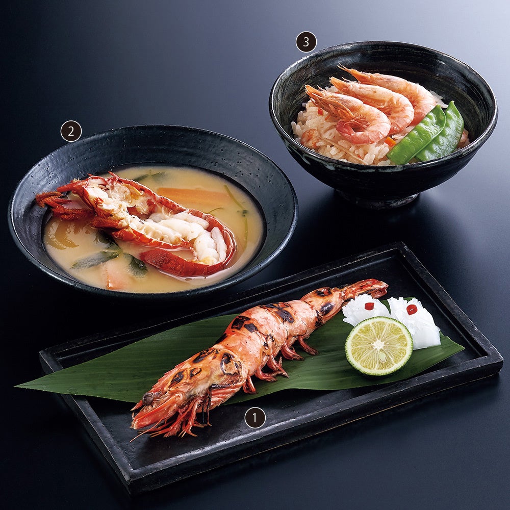 天然足赤海老を高温で焼き上げてぷりぷりの触感を生かした①は、地元鳴門の塩が海老の風味を引き立てています。②は伊勢海老に上品な甘さの白味噌と出汁を合わせました。鰹節と海老の出汁が米にしっかりとしみ込んだ➂は、磯の香りが印象的な一品。絹さやの緑色も鮮やかです。