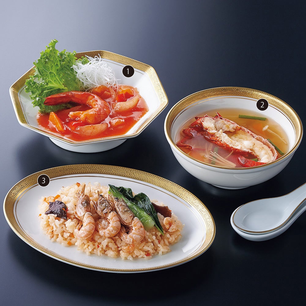 ①は特製チリソースの辛味と大ぶりの足赤海老の甘味が絡み合い、ぷりぷりの食感とも相まって箸が進みます。伊勢海老の濃厚な風味が凝縮された②は、筍など野菜の旨味や歯ごたえも魅力です。➂は甲高管髭海老と野菜、米を中華風スープで炊き上げました。豆板醬の辛味がアクセント。