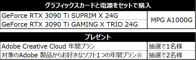 この度、エムエスアイコンピュータージャパン株式会社は、2022年4月6日(水)から2022年5月22日(月)の期間に、対象のMSI製グラフィクスカードと電源ユニットをセット、もしくはどちらかを単品で購入されたお客様から抽選で豪華賞品の当たる「最強のコンビ クリエイター応援キャンペーン!」を開催いたします。