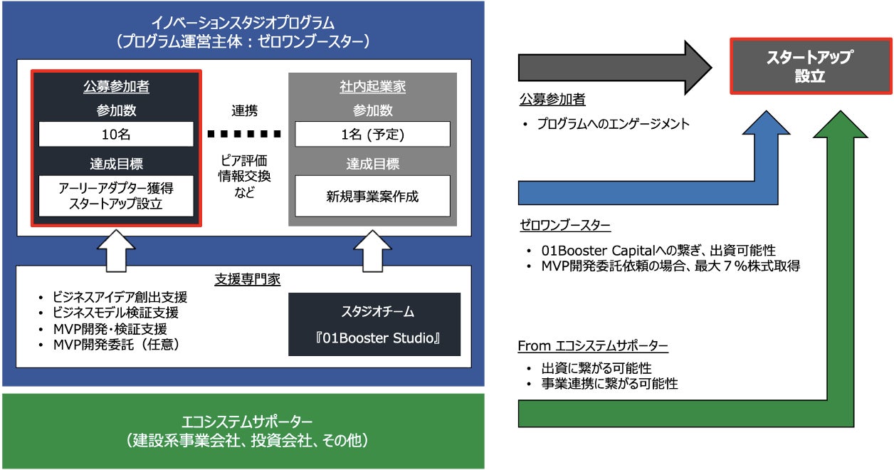 株式会社ゼロワンブースター(本社:東京都千代田区、代表取締役 会長:鈴木 規文/代表取締役 CEO:合田 ジョージ、以下「01Booster」)のベンチャースタジオ「01Booster Studio」(愛称:Founder Zero)は、建設領域にフォーカスした起業支援プログラム「イノベーションスタジオプログラム#1」に参加する起業家を、2022年7月より募集開始しました。本スタジオは、建設領域に特化したプログラムを提供するベンチャースタジオです。建設領域でスタートアップをしたい会社員・学生・フリーランス等の方の応募お待ちしております。