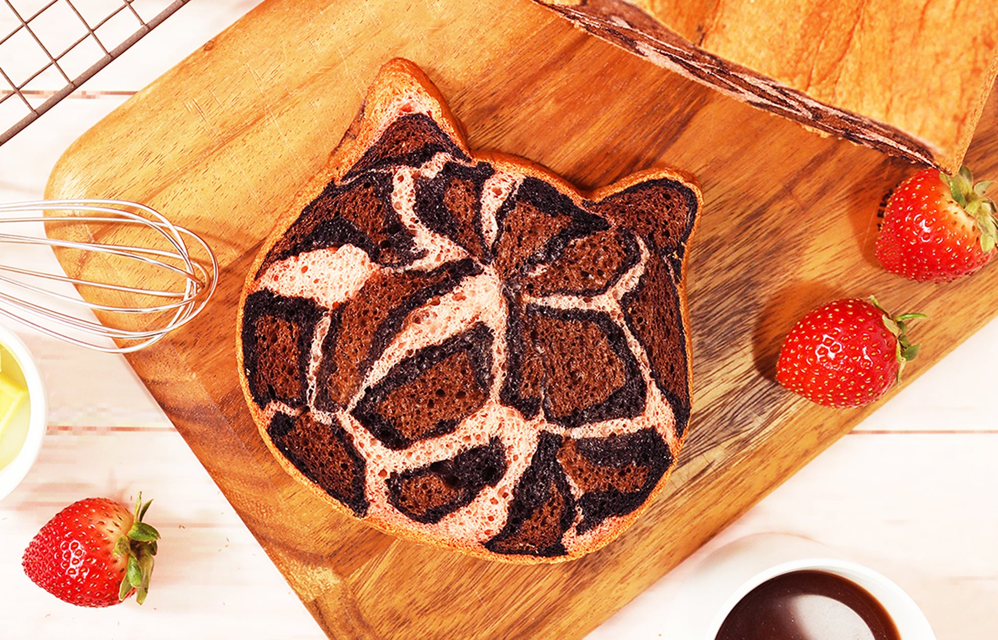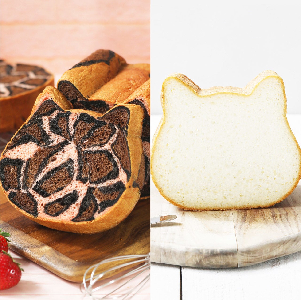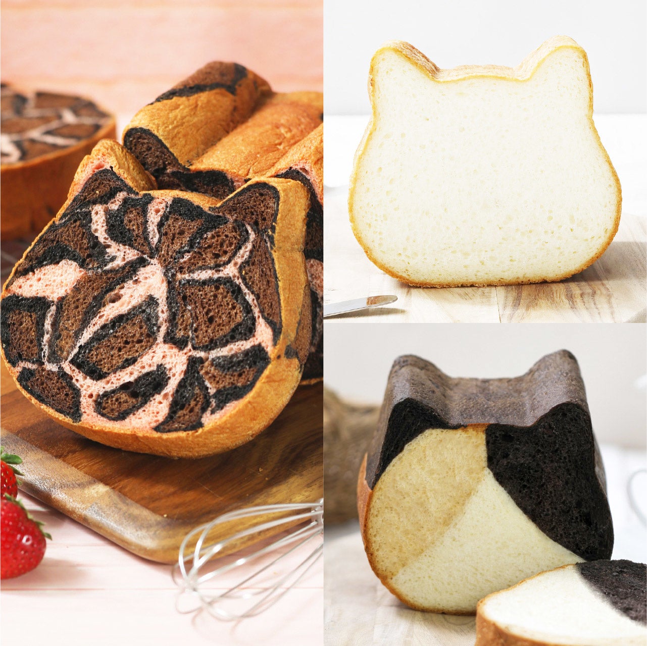 「ねこねこ食パン ピンクのヒョウ」は、いちご、ココア、ブラックココアの3種類の生地を使用した、一度に3種の味わいをお楽しみいただける贅沢なねこねこ食パンです。ミルク100%を使用したミルキーな味わいに、ブラックココアでほんのりとビターな味わいをプラス。ほのかに香るいちごの風味が全体を甘く優しく包みこんでくれます。