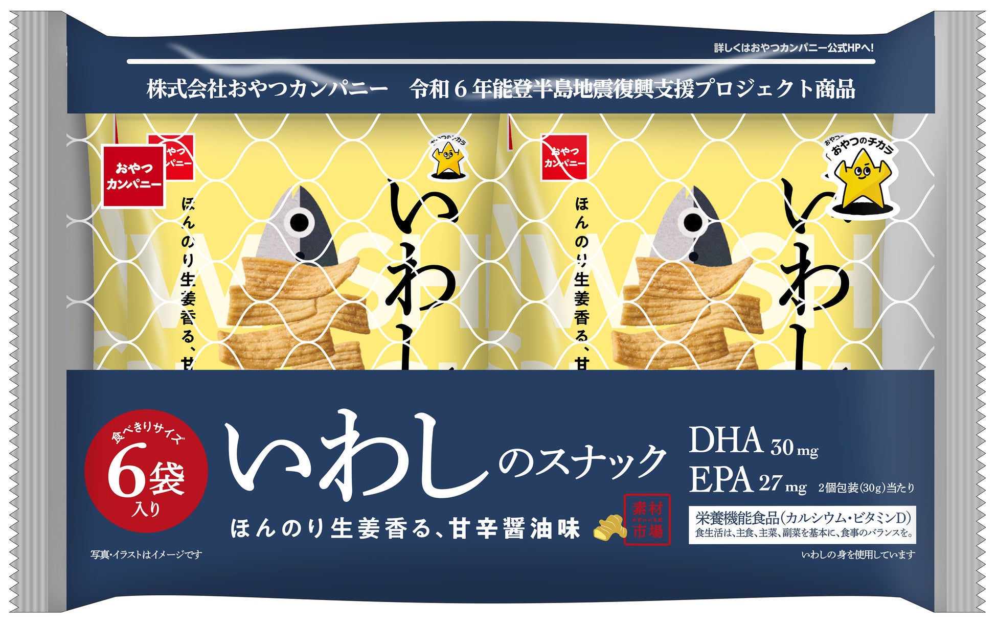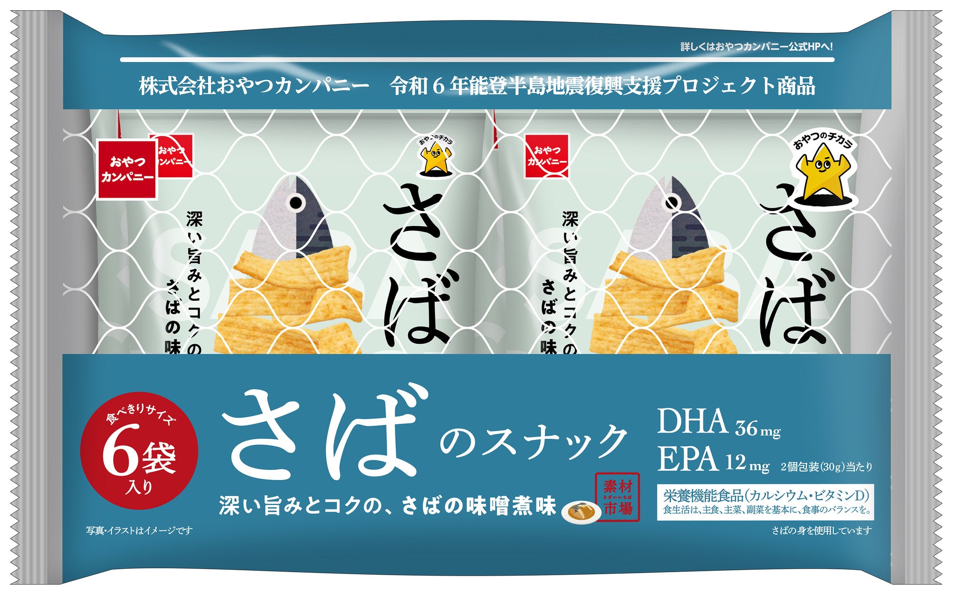 株式会社おやつカンパニー(本社所在地:三重県津市 代表取締役社長:横山正志)は、2024年5月20日(月)より全国にて発売する「素材市場いわしのスナック」「素材市場さばのスナック」の6袋入りパックの売上の一部を、「令和6年能登半島地震復興義援金」として日本赤十字社を通じて寄付いたします。