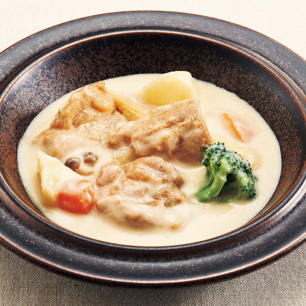 柔らかくジューシーな鶏肉が、濃厚なホワイトソースと見事に調和したクリーム煮です。乱切りにしたニンジン、ジャガイモ、ブロッコリーなどの野菜を加えて彩りに。コクのあるやさしい味わいのクリーム煮は、ご飯との相性も格別です。
