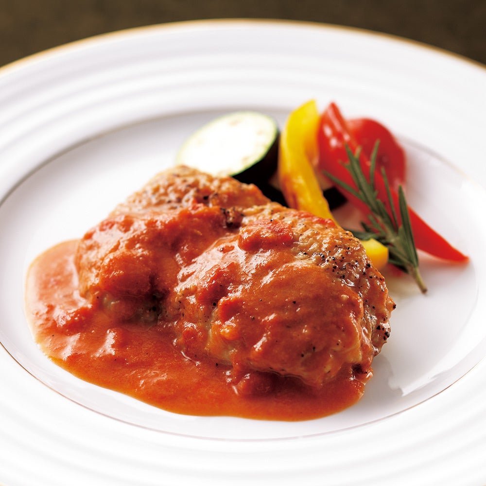 柔らかい鶏のモモ肉にこんがりと焼き目をつけ、ジューシーさを閉じ込めるように焼き上げました。特製のトマトソースは、隠し味としておろしニンニクを使用。生クリームのような濃厚な味わいが、鶏肉の旨みを引き立てています。