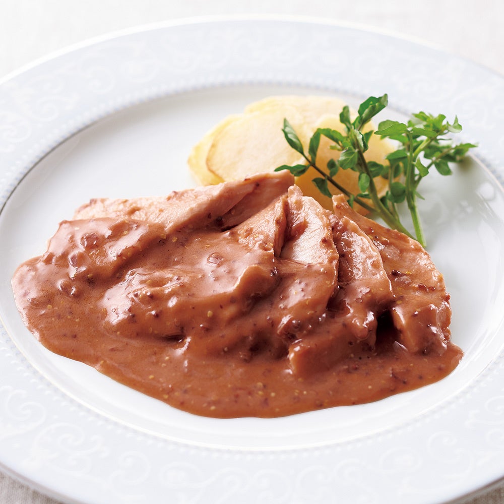 しっとりと柔らかく蒸した鶏肉をスライスし、エシャロット、赤ワイン、バター、粒マスタード、デミグラスソースを合わせました。粒マスタードとバターがきいた濃厚でコクのある味わいは、お店でも人気のメニューです。パンにソースをからめて食べるのもお薦めです。