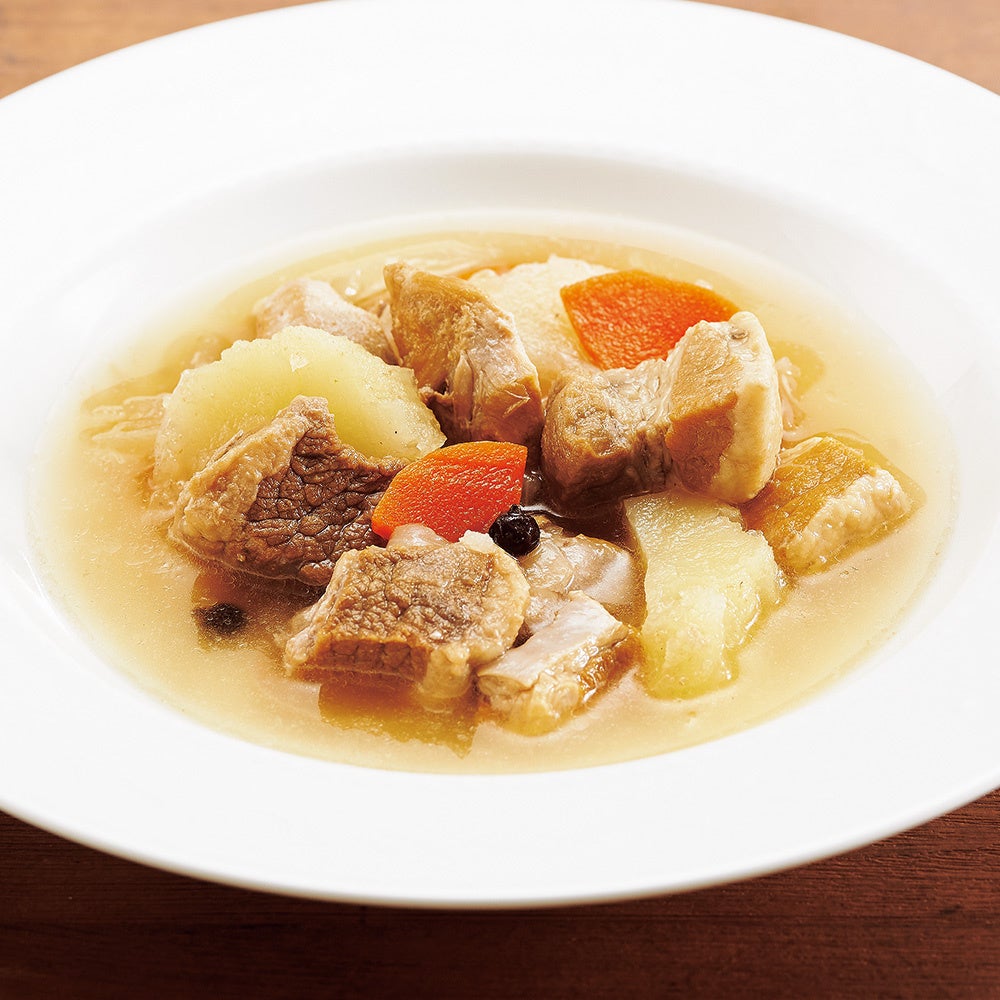 ベックオフというフランス・アルザス地方の家庭料理。豚肉、鶏肉、牛肉と3種の肉を使用し、ジャガイモ、ニンジン、玉ネギ、セロリ、白ワインに水を加えて煮込みました。ジュニパーベリー、ローレル、タイムを使ったアルザス風味も魅力です。