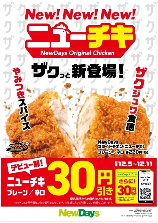 発売を記念して、12月5日から12月11日まで、「ニューチキ」を30円引きセールを実施いたします。また、NewDaysアプリでは、「ニューチキ」の30円引きクーポンを配信いたします。