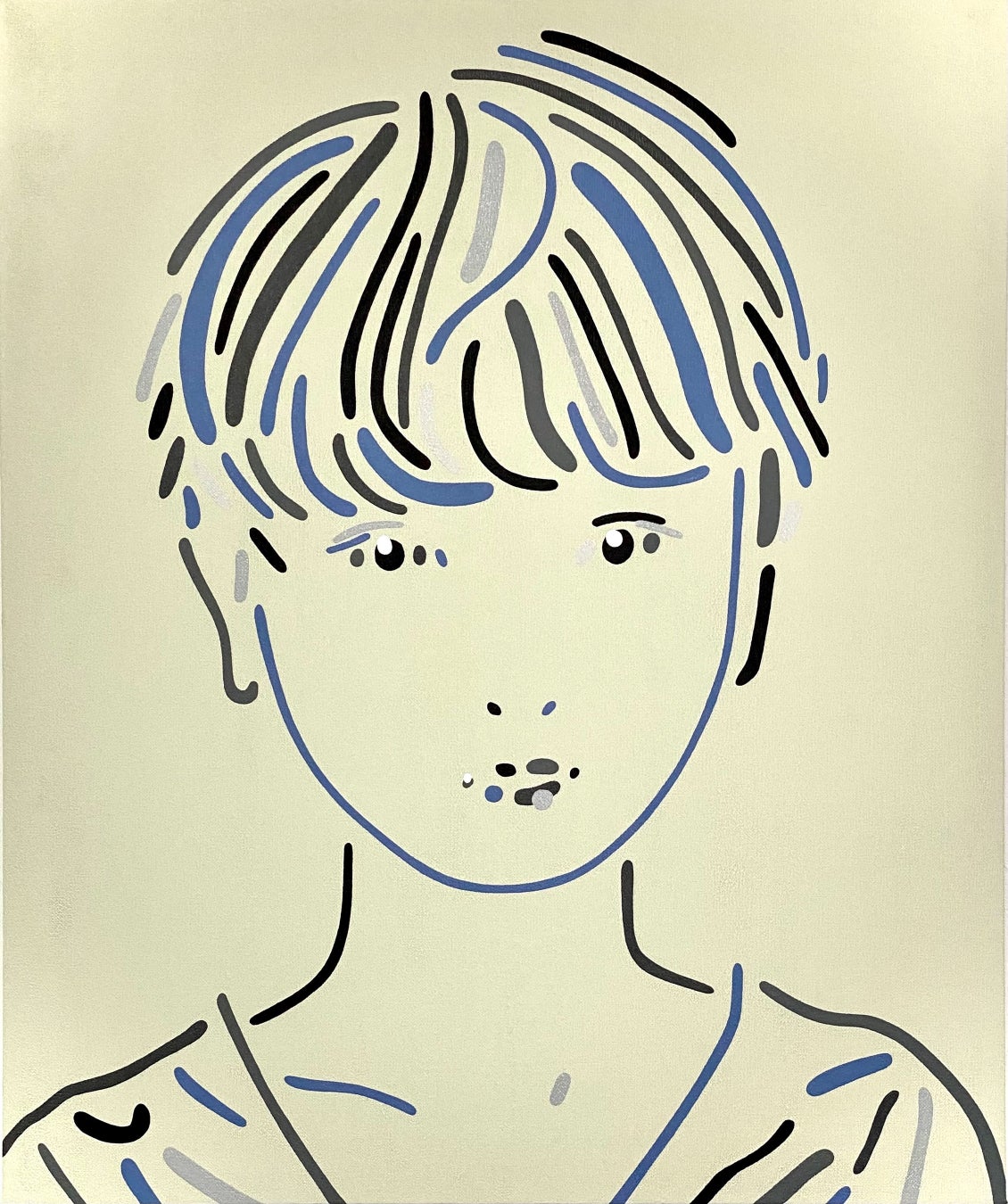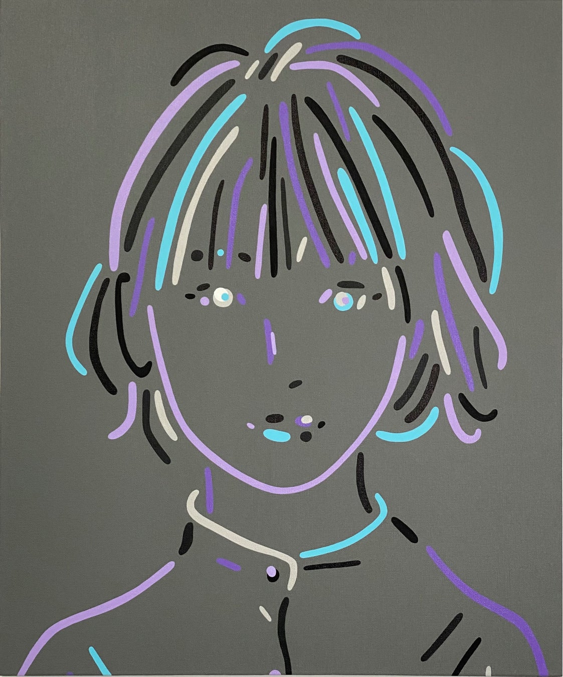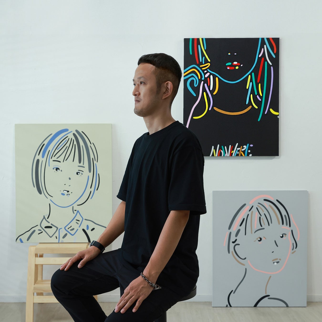 本展は「LINE OF TODAY ― 今日という線、今を生きる私」と題し、彼の代名詞である、今を生きる女性を表現した作品を新作を中心に発表します。社会情勢や流行病、環境問題など不安定な時代の中を、しなやかに、そしてたくましく生きる女性を、モノトーンの背景の中に浮かぶ一筋の光のような鮮やかな色で描き出します。