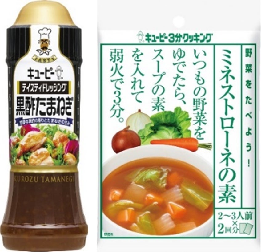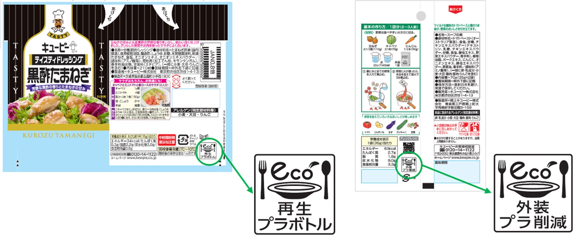 ラベルを付与することで、環境に配慮した商品をお客さまに分かりやすく伝えることを目指します。まずは、再生プラスチックを100%使用※1した「テイスティドレッシング」シリーズ7品とプラスチックを約30%削減した「キユーピー3分クッキング 野菜をたべよう!スープの素」シリーズ3品に付与していきます※2。いずれの商品も2月上旬から容器・包装の切り替えタイミングに合わせて順次変更していきます。