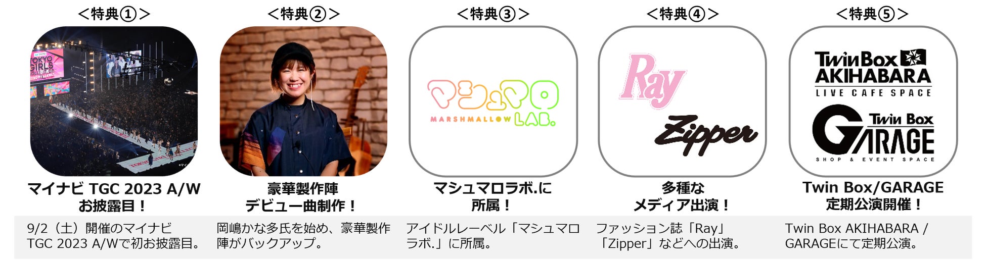 アイドル特化型レーベル「マシュマロラボ.」は、秋葉原のアイドル文化拡大を目指し、「マシュマロラボ. presents 次世代アイドルオーディション」を開催します。アイドルの新時代を切り開くこのオーディションは、アイドルの枠を超え、多様な活動領域を提供し、新たな価値観を持ったアイドルを発掘します。TGCを始めとする大型イベントへの出演など、アイドル業界に新風を吹き込むとともに、秋葉原のアイドル文化の活性化に寄与します。