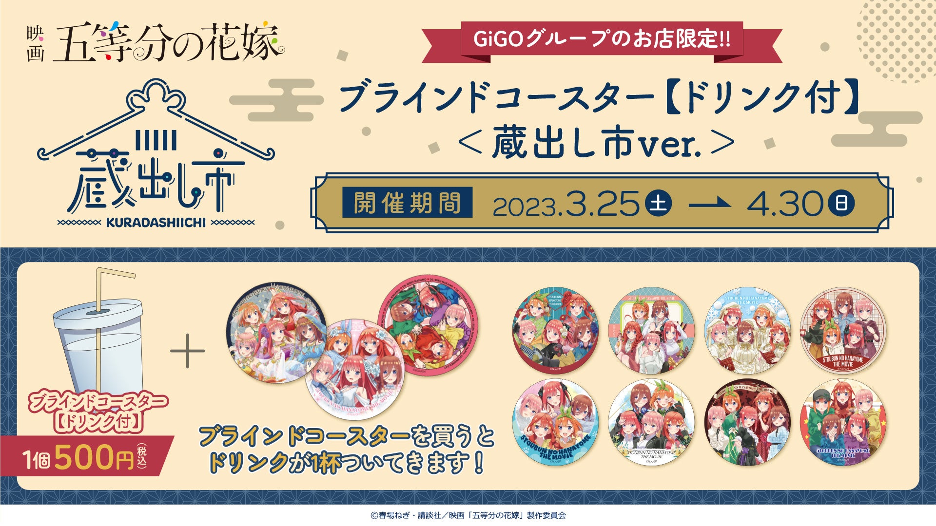 株式会社GENDA GiGO Entertainment(本社:東京都港区 代表取締役社長:上野 聖)と、株式会社アイオウプラス(本社:東京都千代田区 代表取締役社長:兼光 一博)は、GiGOグループの店舗にて2023年3月25日(土)より「映画『五等分の花嫁』AU-COOP蔵出し市-全国キャラバン-」を開催いたします。