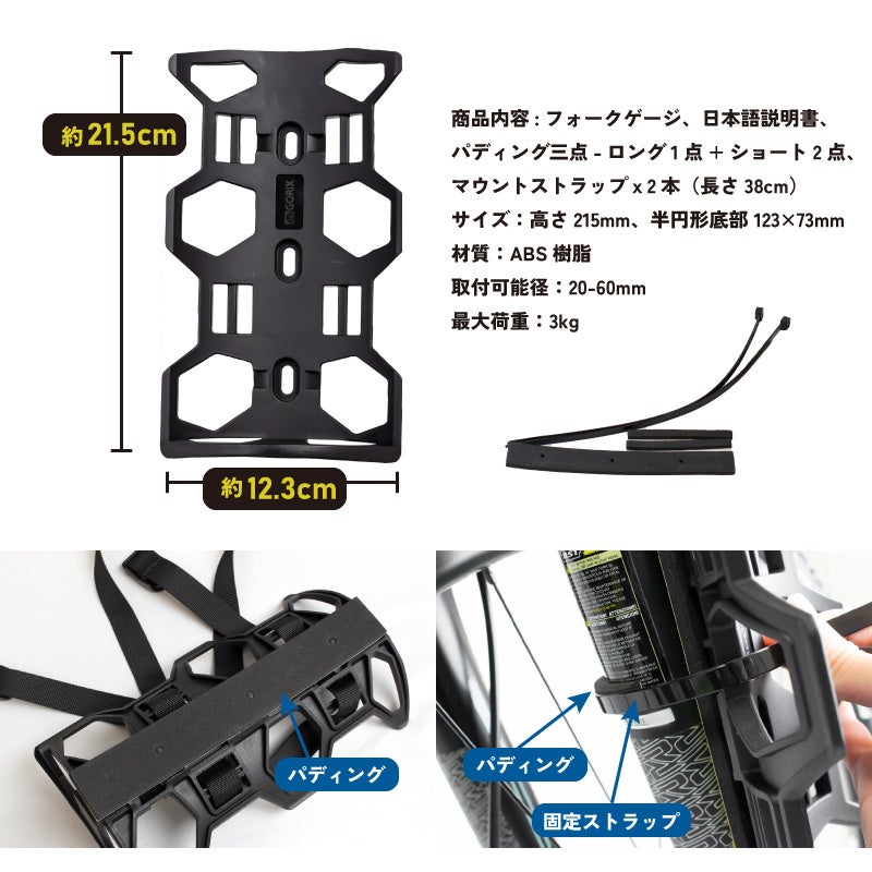商品内容 | フォークゲージ、日本語説明書、パディング三点-ロング1点+ショート2点、マウントストラップx2本(長さ38cm) |