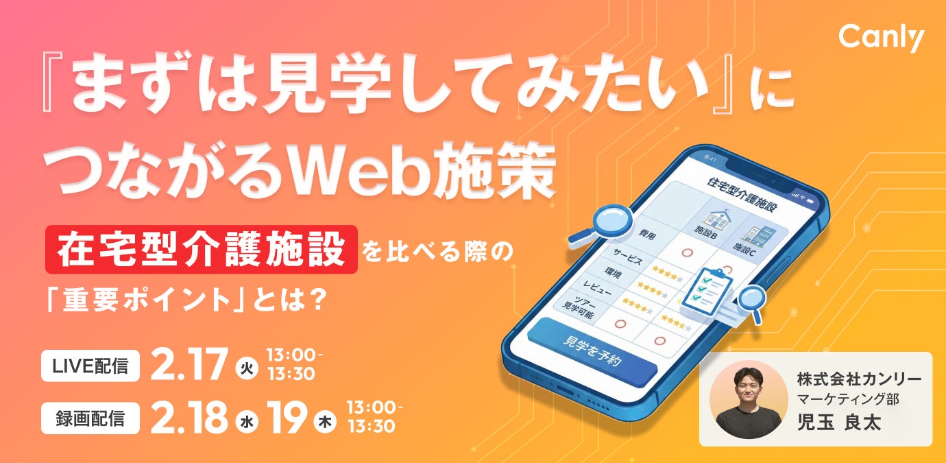 Google ビジネスプロフィール、Yahoo!プレイス、Appleマップなどの3大地図媒体、HP、アプリ、SNSなどの店舗集客媒体の一元管理サービス「カンリー店舗集客」の開発・提供を行う株式会社カンリー(所在地:東京都品川区、代表取締役:辰巳 衛,秋山 祐太朗)は2026年2月17日(火)・18日(水)・19日(木)の3日程で介護業界向けセミナー【「まずは見学してみたい」につなげるWeb施策 〜住宅型介護施設を見比べる際の「重要ポイント」とは?〜】をオンライン開催いたします。