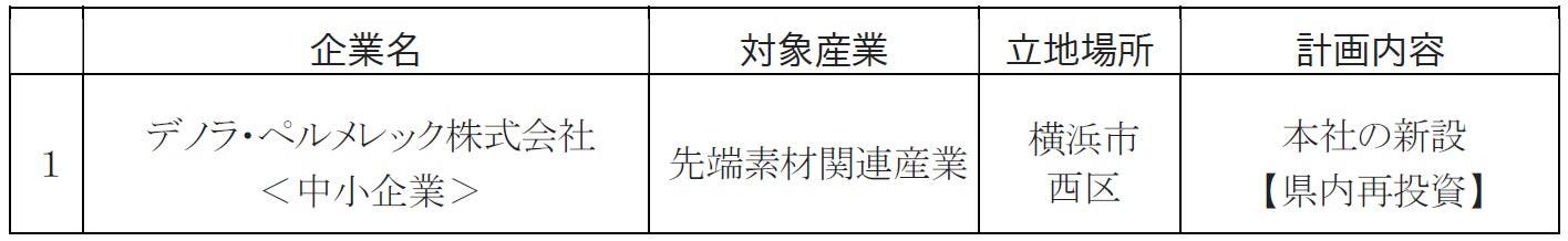 ・デノラ・ペルメレック株式会社は、横浜市企業立地促進条例に基づく事業計画の認定も受けています。