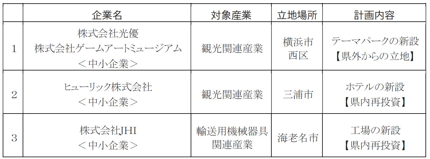 ・県外からの立地企業1社の新設計画及び県内企業2社の再投資計画を、「セレクト神奈川NEXT」の企業立地支援事業として認定
