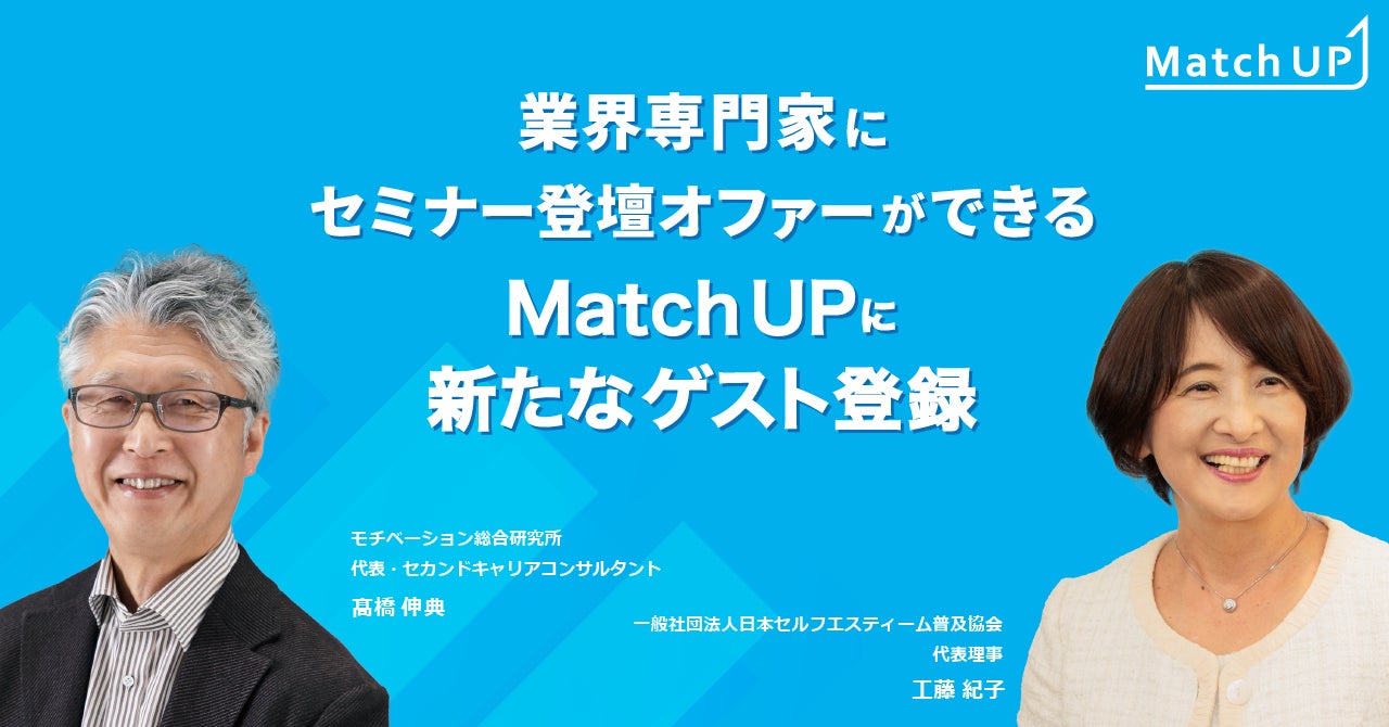 専門家にセミナー登壇オファーができる「Match UP」日本セルフエスティーム普及協会工藤紀子氏、モチベーション総合研究所髙橋伸典氏が新たにゲスト登録