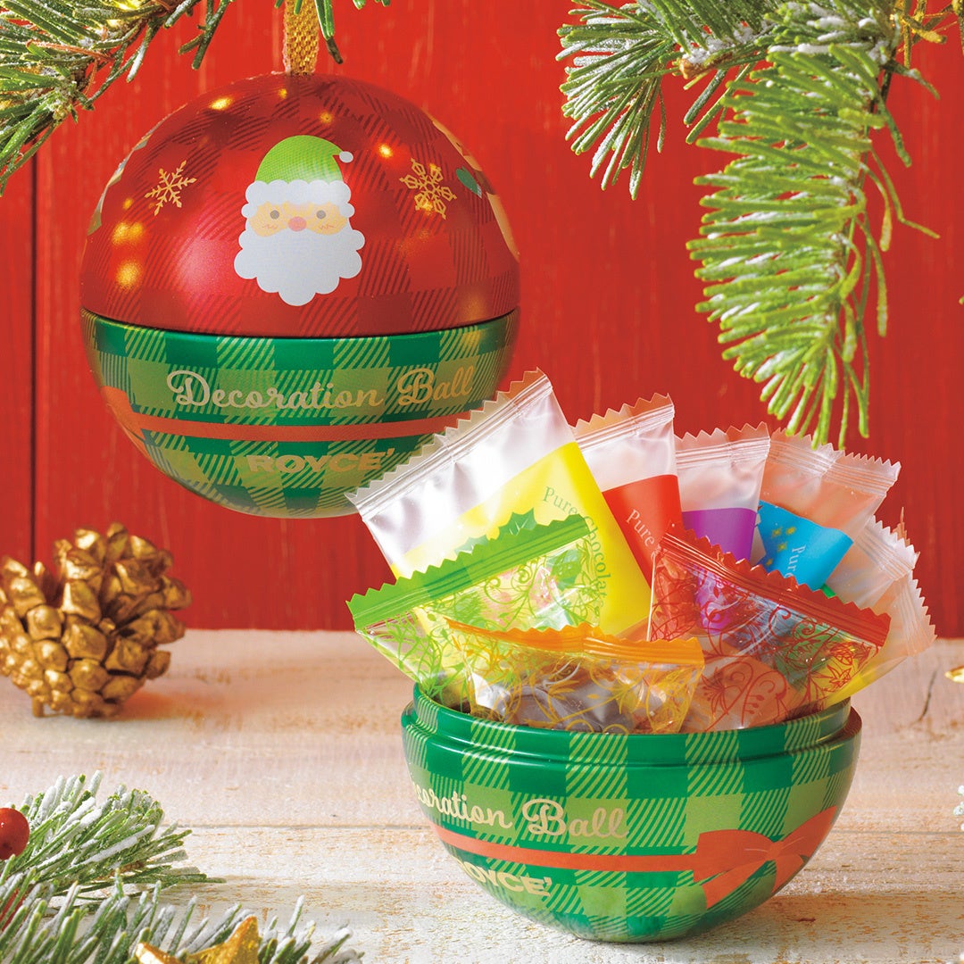 チェック柄がきらめく丸い缶に、ロイズの人気商品を少しずつ詰め合わせました。サンタさんのイラストをあしらった赤と緑のかわいらしい色合いの缶は、オーナメントとしてクリスマスツリーに飾ることができます。