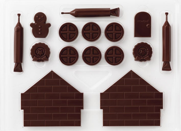 チョコレートでできたパーツを付属のペンチョコで貼り付けて組み立てると、まるごと全部食べられるお家が完成。アイディアやセンスを生かしてデコレーションすると、世界でたったひとつのチョコレートの家に。パッケージにはかわいい妖精たちがチョコレートの家を組み立てている様子が描かれています。
